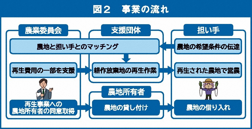 市は本年度、関連部局や管内JAなどと協議を重ね、当事者に代わって遊休農地を解消する団体(支援団体)向けの市単独事業「農地再生チャレンジ支援事業」を創設。同事業は、所有者に負担を求めずに遊休農地を解消し、意欲ある担い手が当該農地を借り受けることが可能だ。事業の流れは、農業委員会や支援団体が担い手と農地のマッチングを行い、事業実施について農地所有者の同意が取得できれば、支援団体による遊休農地の再生作業が行われる。並行して農地中間管理事業による農地の貸し付け(使用貸借に限る)が行われ、支援団体には実績払いとして10㌃当たり上限20万円の補助金が農業委員会から交付される。